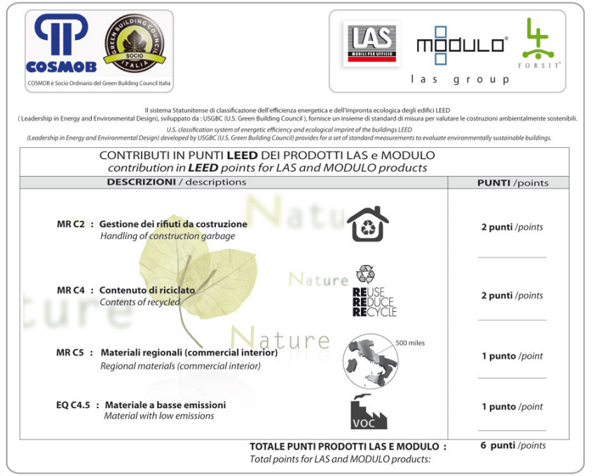LAS MOBILI obtuvo el prestigioso certificado que respalda las mejores especificaciones de Calidad, Medio ambiente y Seguridad. Los procesos de producción de LAS MOBILI contribuyen a la conservación del medio ambiente, pues La certificación LEED que poseen los productos ha sido obtenida por el uso de materiales reciclados, materiales que en un futuro pueden regenerarse o reciclarse y las bajas emisiones de COV, en los procesos de producción.